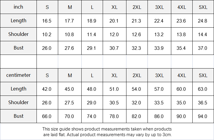 | centimeter | S | M | L | XL | 2XL | 3XL | 4XL | 5XL |