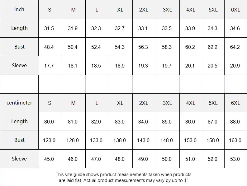 | centimeter | S | M | L | XL | 2XL | 3XL | 4XL | 5XL | 6XL |