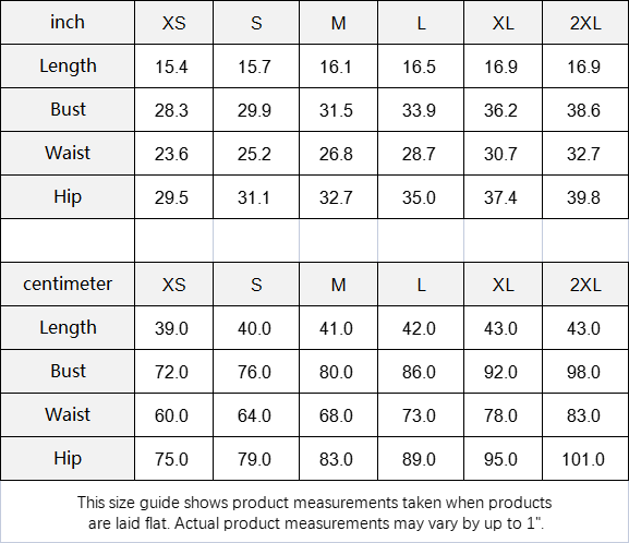 This size guide shows product measurements taken when products are laid flat. Actual product measurements may vary by up to 1".