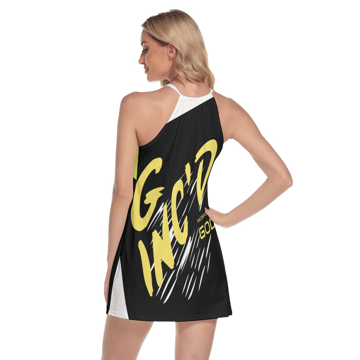 Perfect sexy dress in this summer. The metal half moon ring and halter strap outline a sexy and charming curve